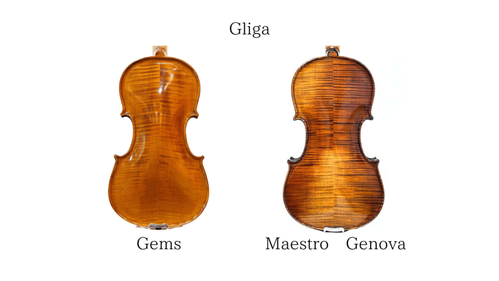 こちらの写真は当店で取り扱うルーマニアの工房「Gliga(グリガ)」の一番お求めやすいグレードの「Gems」と、最高グレードの「Maestro Genova」のそれぞれの裏板となります。